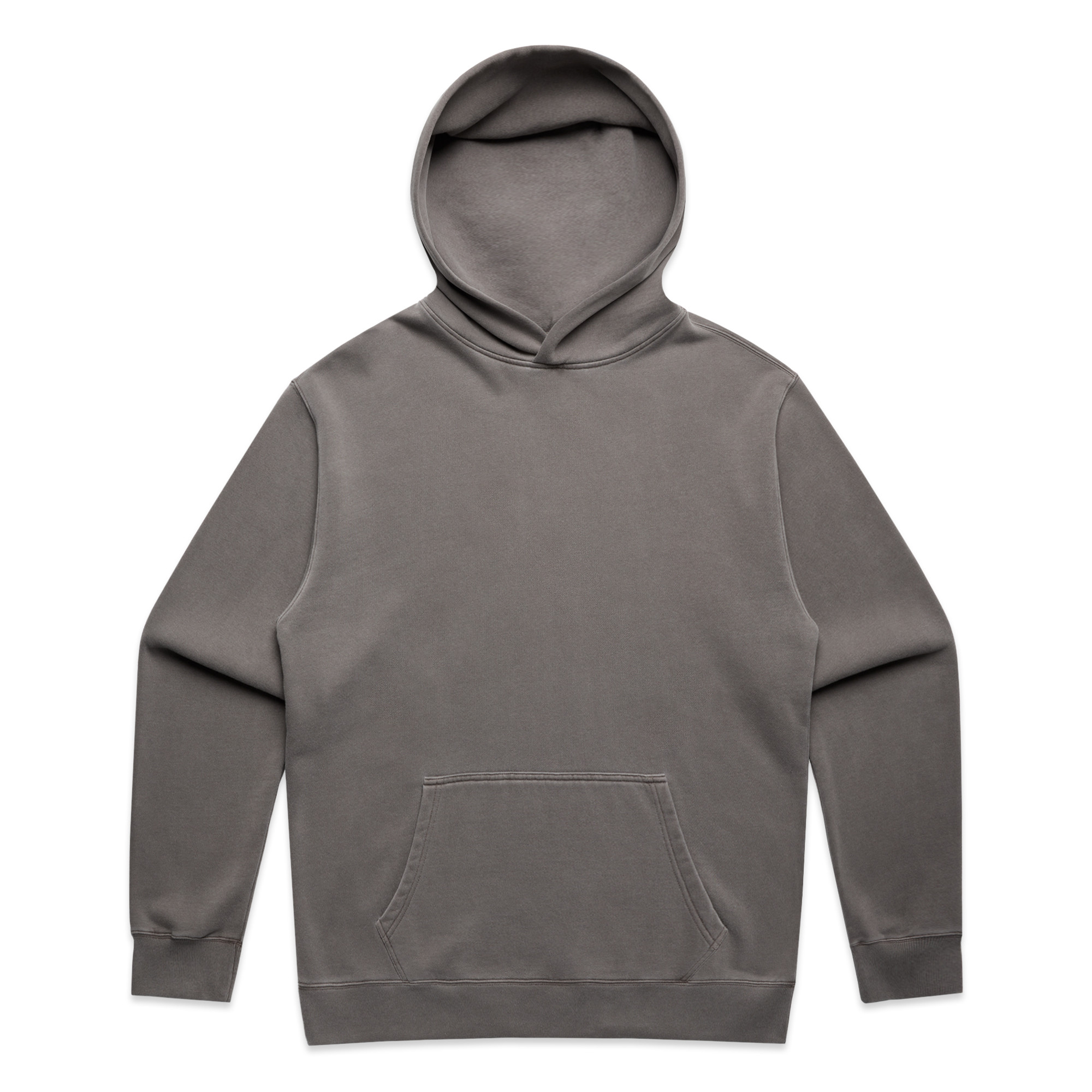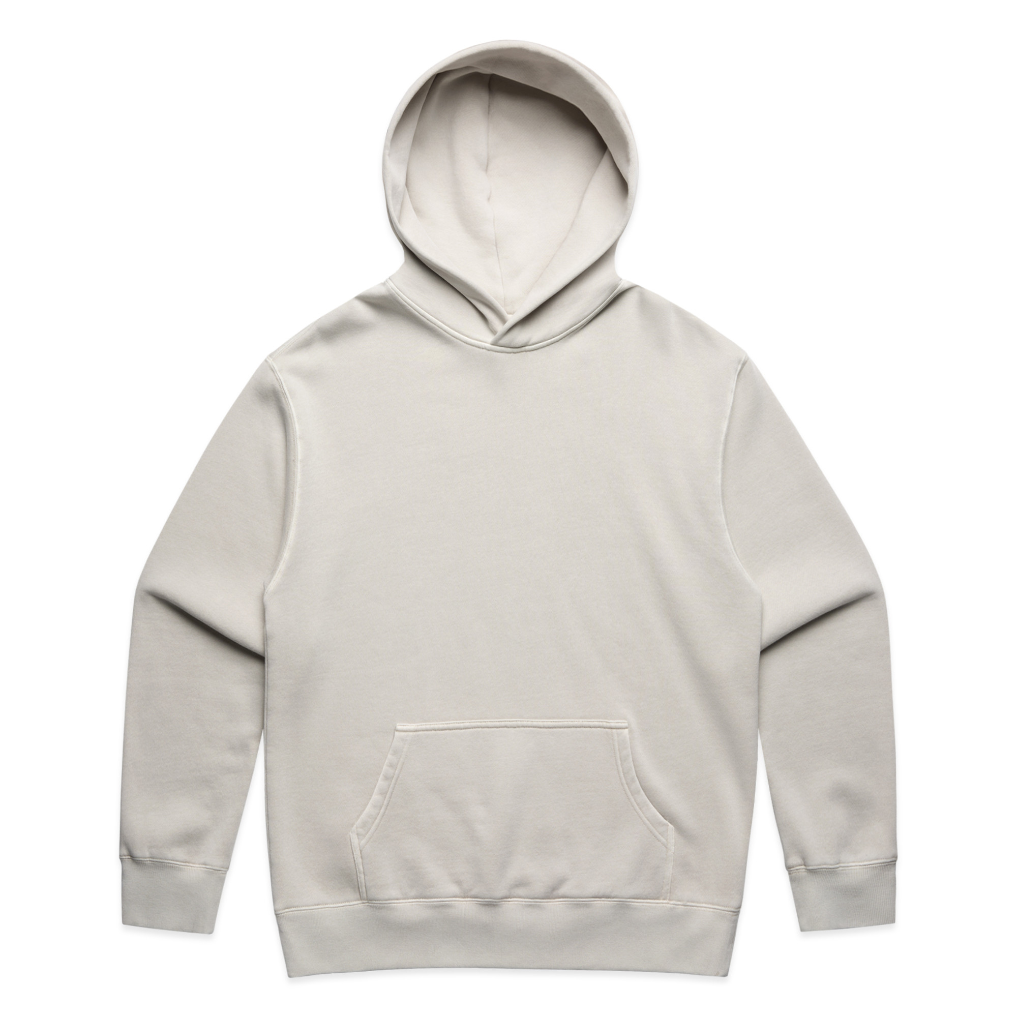 - Pullover hood, drop shoulder, kangaroo pocket, lined hood, no drawcord, sleeve cuff ribbing, garment dyed